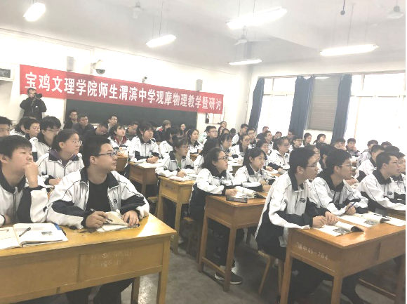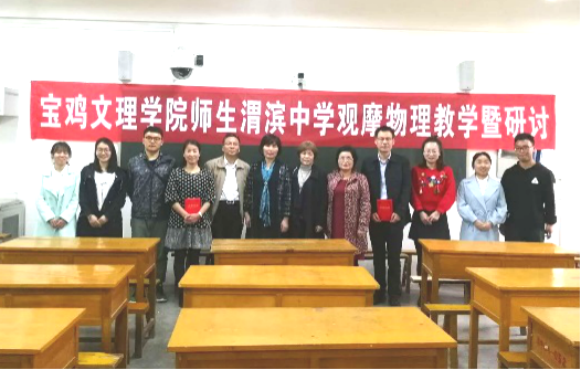 4月10日上午,太阳集团tyc539副经理刘飞老师、沈亦红老师、周云波老师、冯青老师和六名物理教育学专业研究生和本科生共赴宝鸡市渭滨中学开展物理教学联合研讨活动。