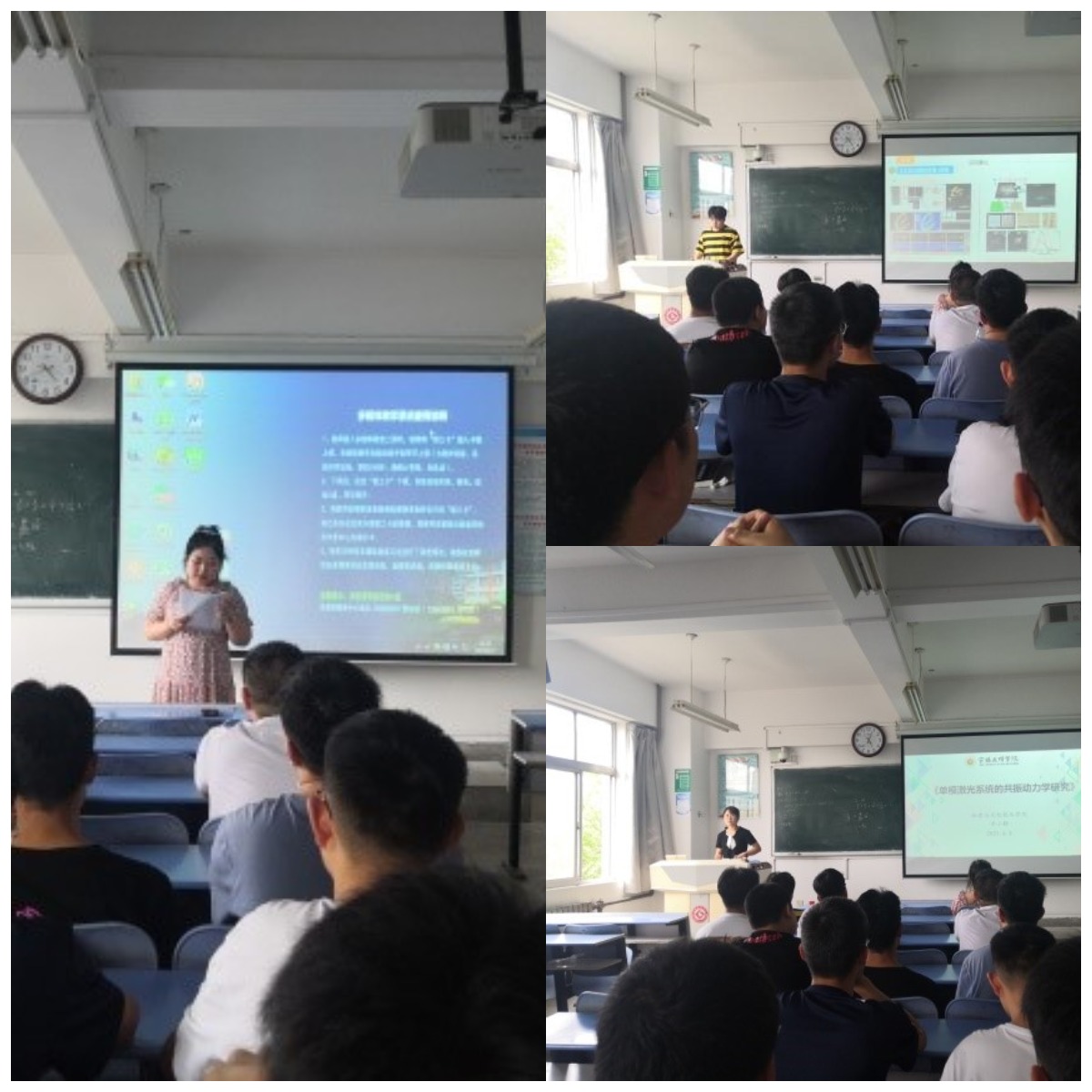 报告会由19级凝聚态物理王萌主持,19级光学工程张鹏飞报告题目应力发光材料的研究,19级理论物理卓小静报告题目为单模激光系统的共振动力学研究。首先由主持人介绍两位报告人的成果和贡献,然后张鹏飞就无机固体发光材料与器件做了一些系统的讲解,对员工科普了在科研中的问题和如何应对困难。之后,卓小静就单模激光系统的共振动力学做了简单的介绍,并对共振的处理做出了自己的看法,使听众受益匪浅。最后,在同学的提问和讨论中,圆满的完成了此次交流会。