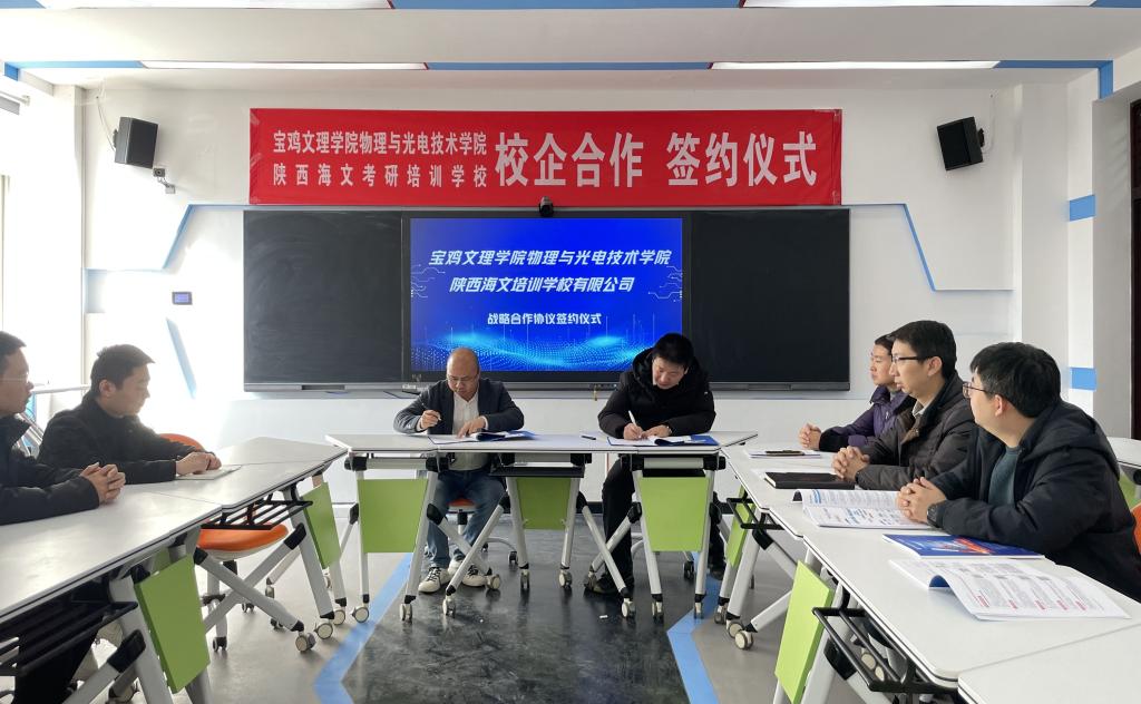 12月7日上午,太阳集团tyc539与万学教育陕西海文培训公司有限公司在石鼓校区教学主楼201会议室举行了校企合作协议签约仪式。物理与光电技术公司党委书记邓茹、经理钱郁、副经理刘飞、周新淳出席仪式。