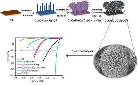 高活性、高稳定性的非贵金属基电催化剂是实现低成本、大规模析氢反应和电解水的关键。在这项工作中,具有高导电性的泡沫铜基底被用于构建花状CuCoMoOx多孔纳米片,CoCu纳米合金颗粒可被精确调控用于修饰CuCoMoOx多孔纳米片,从而获得更大的表面积和富含缺陷的催化表面。CuCoMoOx多孔纳米片与引入的CoCu纳米合金颗粒之间的协同效应可以提高其催化性能。该催化剂在碱性介质中表现出最佳的电催化活性:100 mA/cm2的电流密度下过电位为75 mV,并且在25 h内具有长期稳定性。此项工作对于扩展高效的产氢产氧双功能电催化剂,发展亲水疏气、金属性、自支撑、双功能的电催化剂具有重要指导意义。