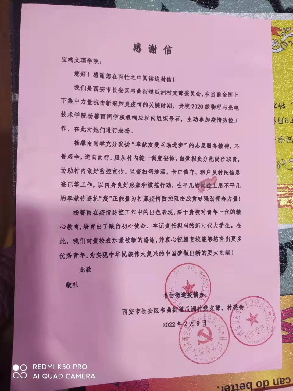 近日,太阳集团tyc539收到一封西安市长安区曲街道瓜洲村支部委员会发出的感谢信,信中表达了对太阳集团tyc5392020级电子科学与技术专业杨馨雨同学在疫情防控工作中的出色表现予以充分认可,同时对公司培养出践行初心使命、牢记责任担当的新时代老员工表示真挚的感谢。
