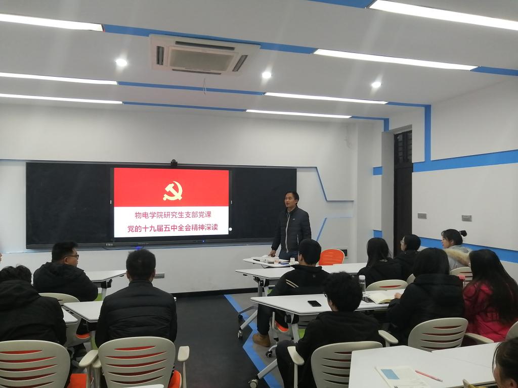 12月2日下午,在主楼201教室,公司副经理周建宏以《党的十九届五中全会精神深读》为题为研究生党支部全体党员讲授党课。