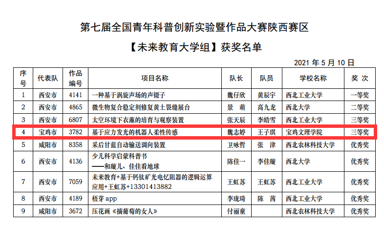 近日,由陕西省科协主办、陕西省青少年科技交流中心承办的第七届全国青年科普创新实验暨作品大赛(陕西赛区)在西安启动。本届大赛以“智能、安全、环保”为主题,包含未来教育、智能环境、生物环境和风能利用4个命题。吸引了来自西安交通大学、西北工业大学、西安电子科技大学等14所高等院校师生参赛。经过激烈比拼,公司2019级物理学专业研究生魏志婷、王子琪的参赛作品“基于应力发光的机器人柔性传感”斩获“未来教育大学组”省级三等奖。