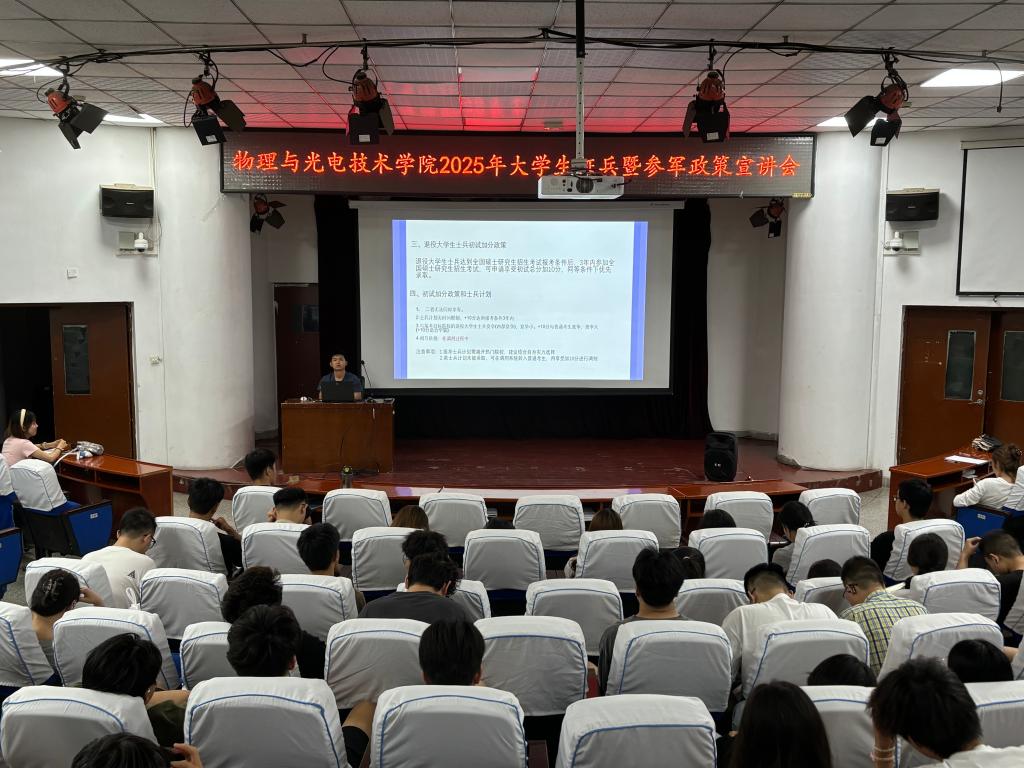 2025年6月5日晚,太阳集团tyc539于石鼓校区1号报告厅举办2025年老员工征兵工作宣讲会暨参军政策宣讲会。公司党委副书记陈冠男、辅导员周小玄及2022-2024级部分员工参加讲座。